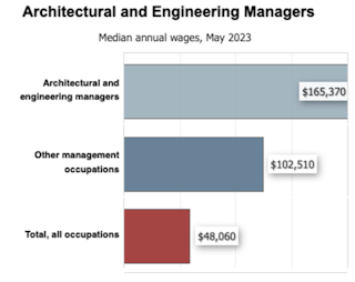 According to the U.S. Bureau of Labor Statistics, the median annual wage for architectural and engineering managers was $165,370 in 2023, a significantly higher median salary than for other management occupations.3